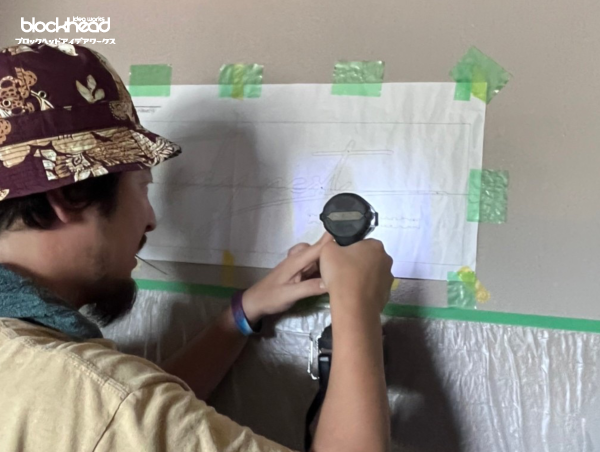 ↓今回の切り文字は線が細く折れやすいため、2人がかりで慎重に取り付けていきます。
