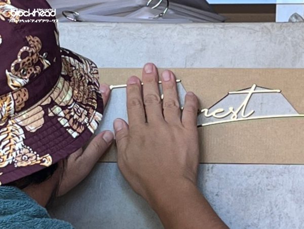 ゴールドの切り文字サイン2つをカウンターと壁に1つずつ施工します。